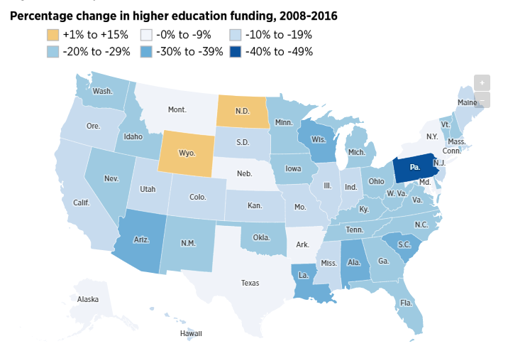 Almost all US states have slashed public higher ed funding on an inflation-adjusted basis over the past 10 years. This is already leading to even more massive student debt loads, falling enrollments, lower graduation rates, and college closings that shatter local economies.pic.twitter.com/P2MDRF551f