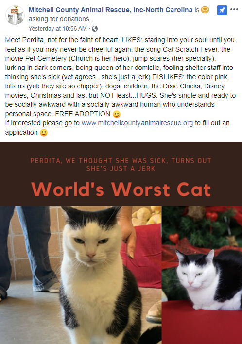 Animal shelter waives adoption fees for "world's worst cat." "We thought she was sick, turns out she's just a jerk."