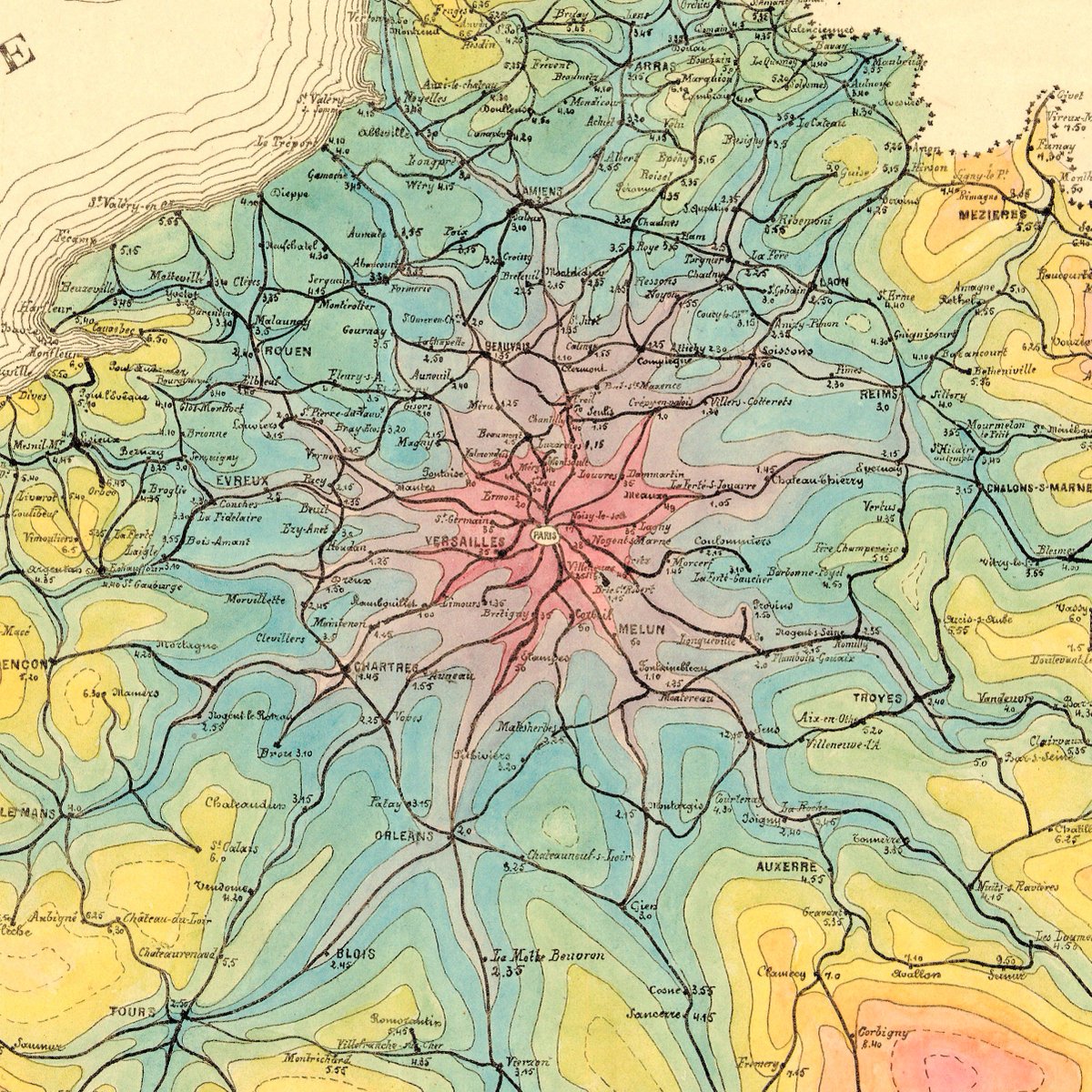 I think I'm in love: a stunning isochrone map of travel times from Paris by rail in 1882 (making this a very early example of the genre).pic.twitter.com/gaSEzGCQWI