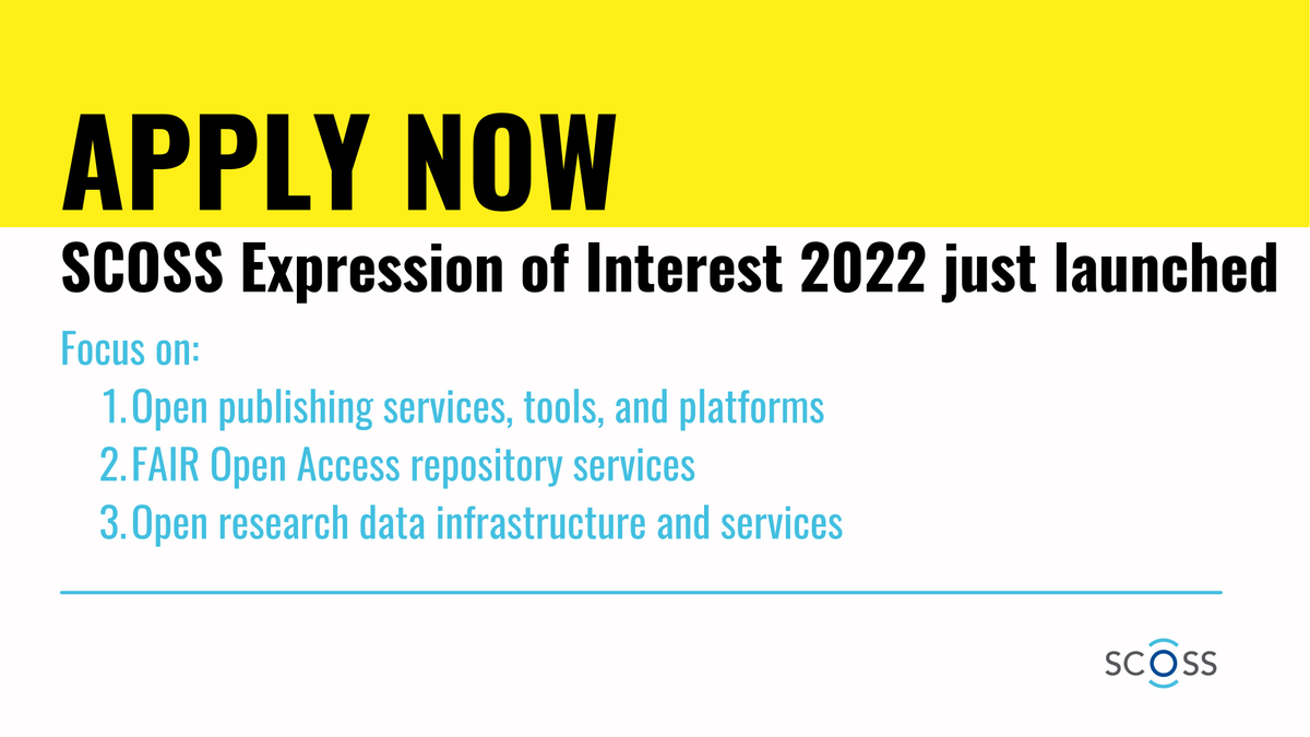 We heard you! The SCOSS Expression of Interest 2022 just launched. This call focuses on 3 types of OSI pointed out as priorities by the community in the SCOSS consultation. Are you an OSI in need of funding? Apply now! https://scoss.org/how-it-works/scoss-expression-of-interest-2022/ …pic.twitter.com/HHDJansMnm