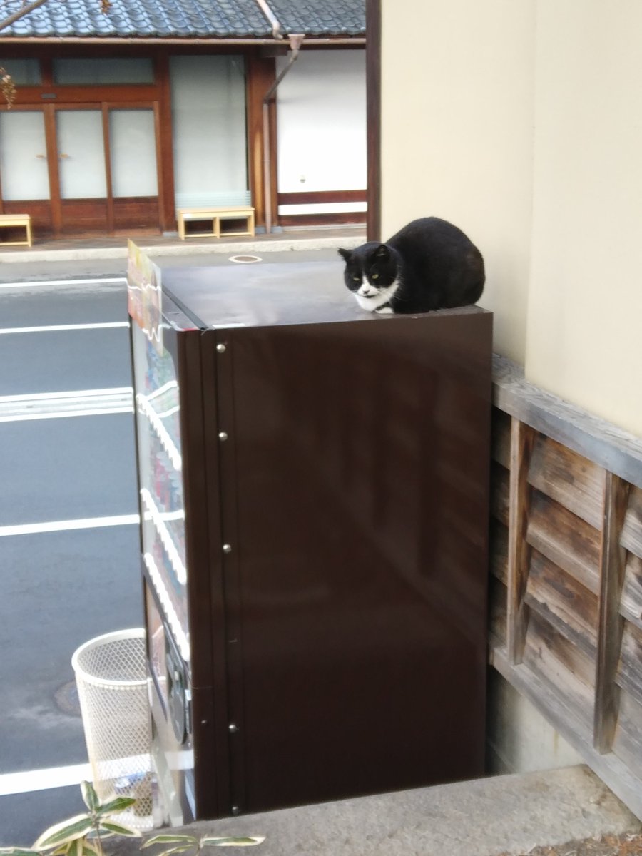 今朝、博物館横の自動販売機上に、最近よく見かける黒猫さんが… そこ、暖かい?