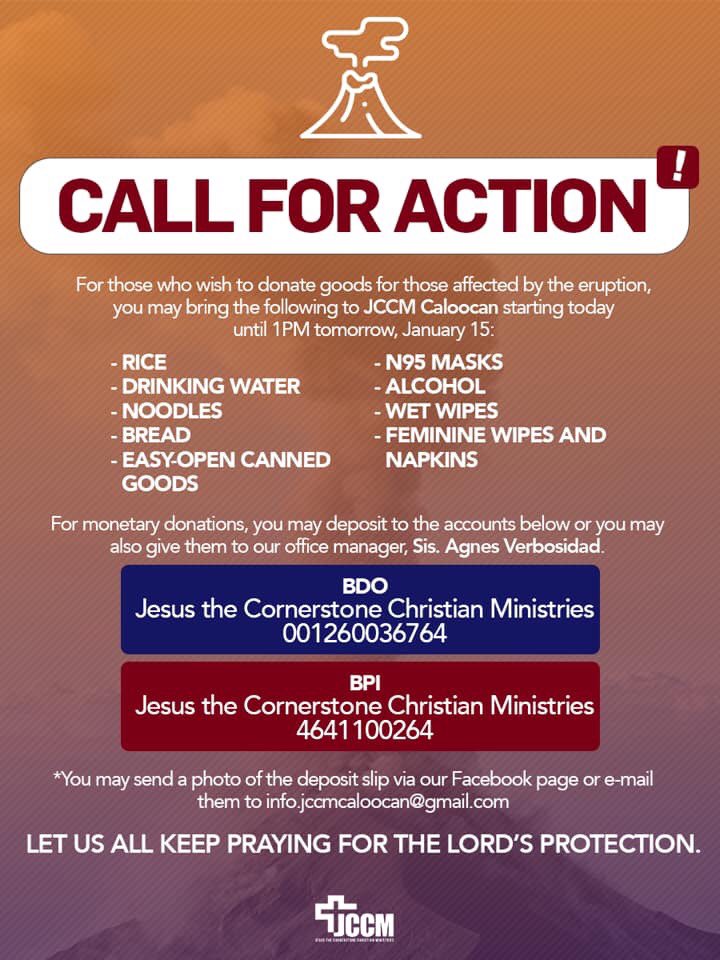 Our church is accepting donations in kind or in cash. Accepting 1st batch of donations til 7pm tonight & from 8am-1pm tom in 8/F Pagibig Bldg EDSA Balintawak (across Honda Balintawak). DM if necessary. For next batches, u may still donate after Jan 15.