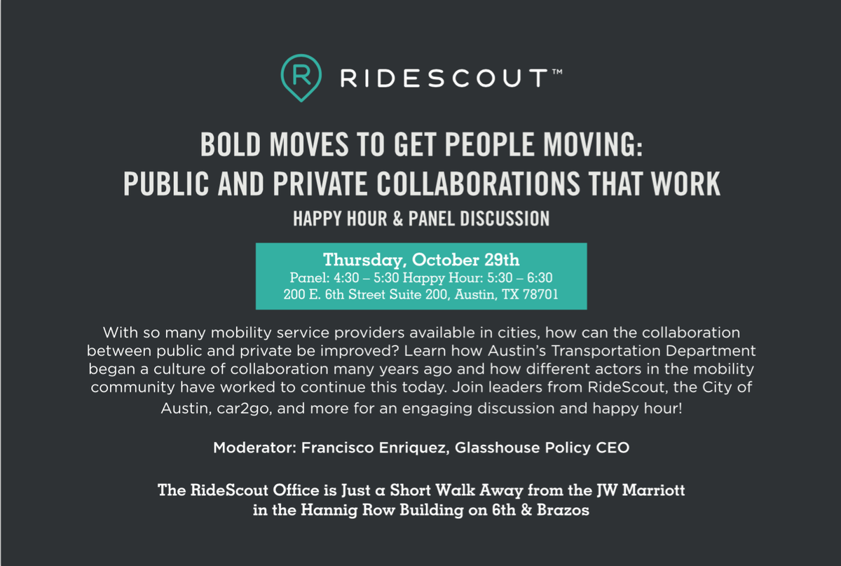 Join us for happy hour / panel discussion with Austin's mobility leaders today at 4:30p at RideScout HQ.