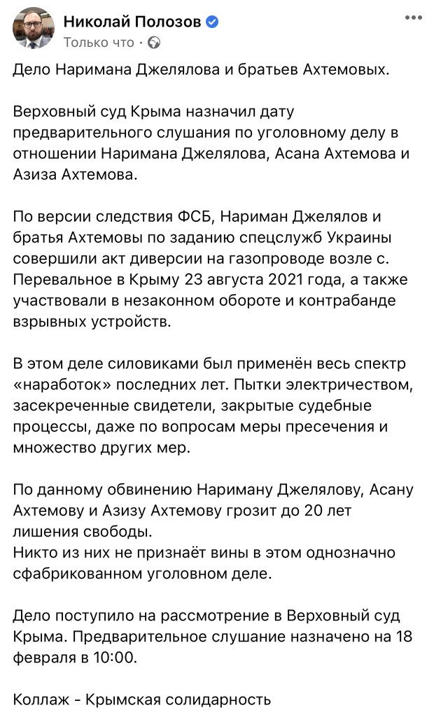 Дело Наримана Джелялова и братьев Ахтемовых. Верховный суд Крыма назначил предварительное слушание по делу на 18 февраля. https://www.facebook.com/100001662173833/posts/4931527363579287/?d=n …pic.twitter.com/TgMPOwohYd