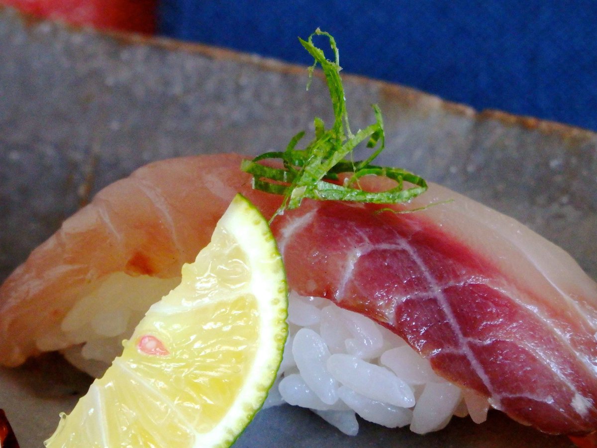 三枚卸に捌いた鮎を和歌山産のきぬむすめを使用し鮎の天ぷらは揚げる前にバーナーで炙り一手間かけて天ぷらすしにしました。