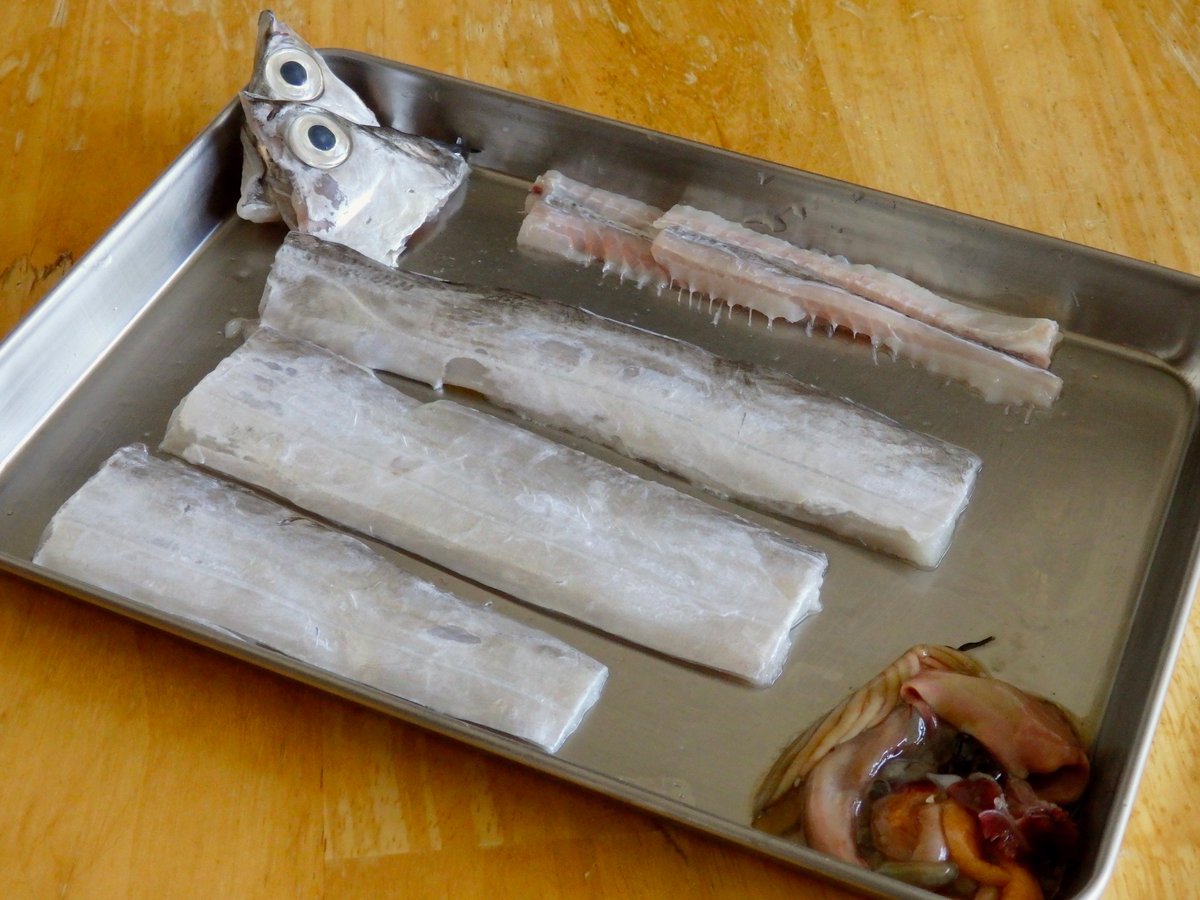 タチウオの捌きの練習をしました。皮がすぐに傷つくので難しいですね。写真は上身になます。