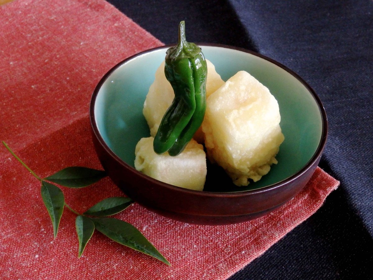 いただきもののお餅を天ぷらにしました。市販品のめんつゆをつけて、揚げだしの様にいただきます。和歌山産の清姫ししとうを添えています。