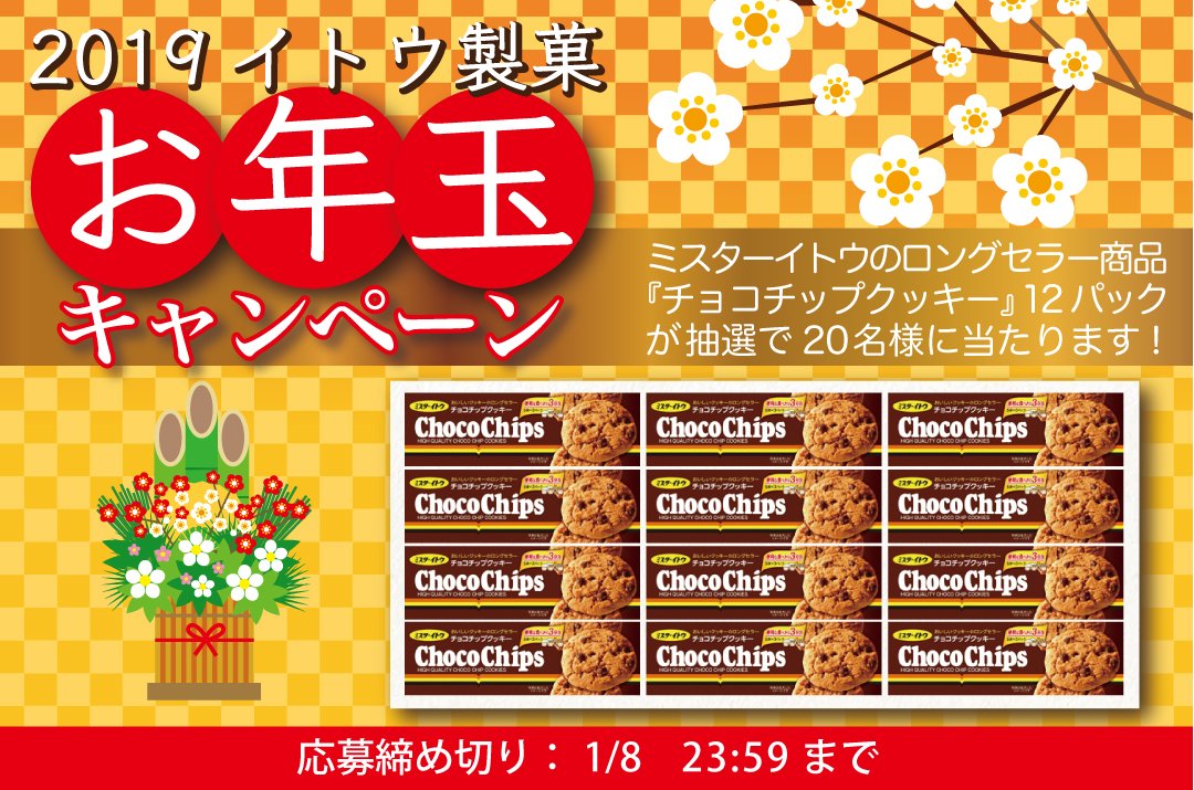 / お年玉キャンペーン【20名様】 \ 1981年発売のミスターイトウのロングセラー商品 「チョコチップクッキー」(15枚入り)12パックを お年玉プレゼントします