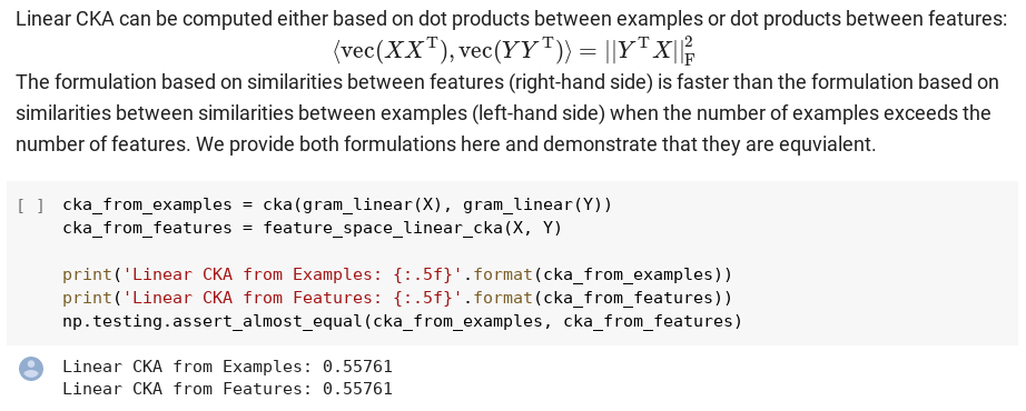 @skornblith 's colab on CKA. It seems obvious in retrospect but I hadn't considered the equivalence of calculating similarities based on examples and based on features. My experiments are so much faster now...