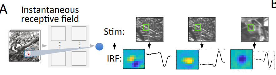 Peering into a deep network trained on retina data: - Instantaneous RFs are context-dependent and state-based - Network subspace used by white noise and natural scenes are different [Nice update from
