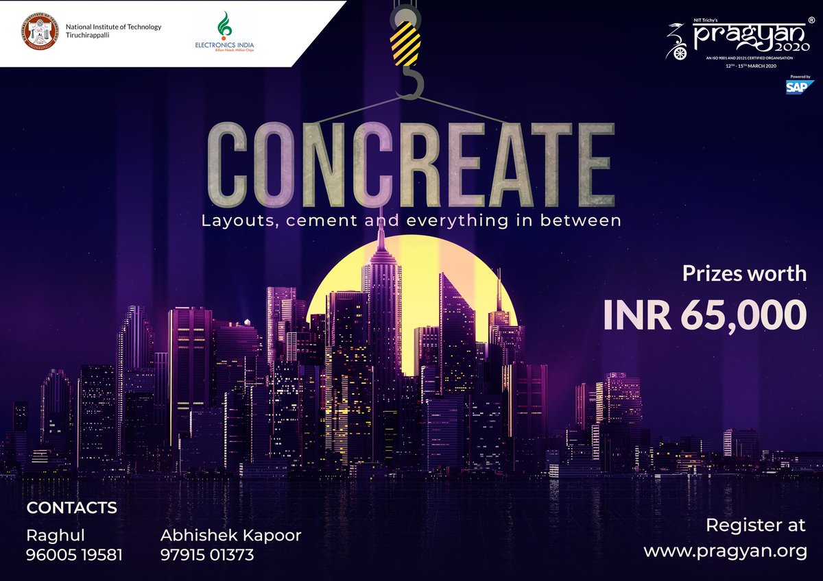 #Pragyan presents the#Concreate event cluster - an opportunity to display your construction and design knowledge. Cash prizes worth INR 65000 are also up for grabs! Find out more at http://prgy.in/concreate#Events#LetsCelebrateTechnology#Pixelpic.twitter.com/x5f1H0Mn2E