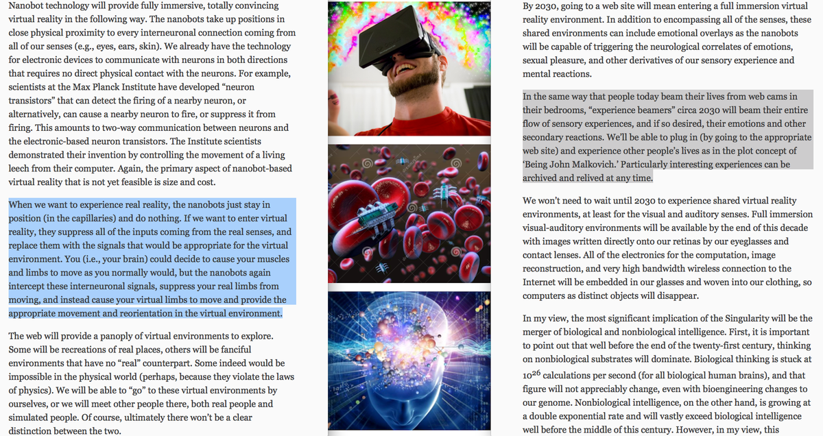 Ray Kurzweil's prediction for VR in 2030 consists of nanobots all over the brain controlling our