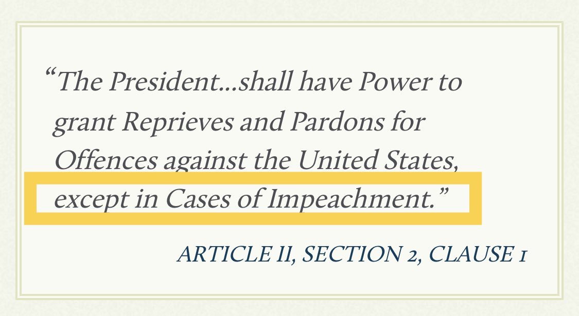 One excellent aspect of the Constitution’s Pardon Clause, Art. II, § 2, cl. 1, is that it specifically excludes “Cases of Impeachment.” The Framers were quite foresightful.pic.twitter.com/kZ4SmBMzI3
