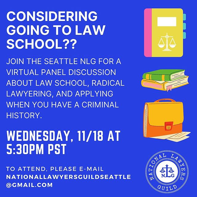 Have you been considering law school because of this year's current events? Please join the Seattle NLG for a virtual panel discussion. Wednesday, November 18, 2020, 5:30pm. If you are interested in attending, please e-mail nationallawyersguildseattle@gmail.com.pic.twitter.com/DfJTYZboWd