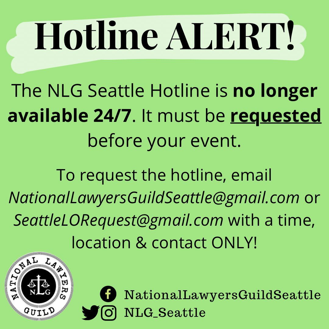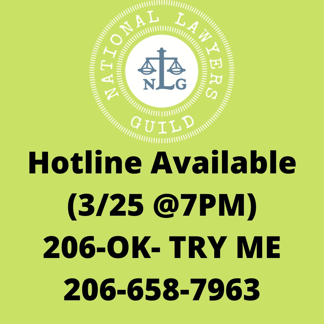 ALERT: Late-breaking news! The hotline will be up tonight (3/25)! If you're out and need legal support, call 206-OK TRY ME. (206-658-7963)pic.twitter.com/AQi8lf7cnq