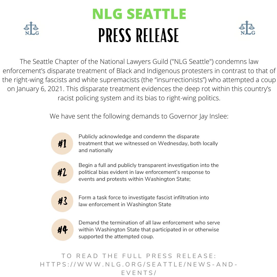 Seattle Chapter of National Lawyers Guild Condemns Law Enforcement's Treatment of BIPOC Protestors in STARK CONTRAST to Right-Wing “Insurrectionists'' An excerpt of the press release follows. To read the full release, please go to: https://www.nlg.org/seattle/news-and-events/ …pic.twitter.com/sbqVmNmrHe