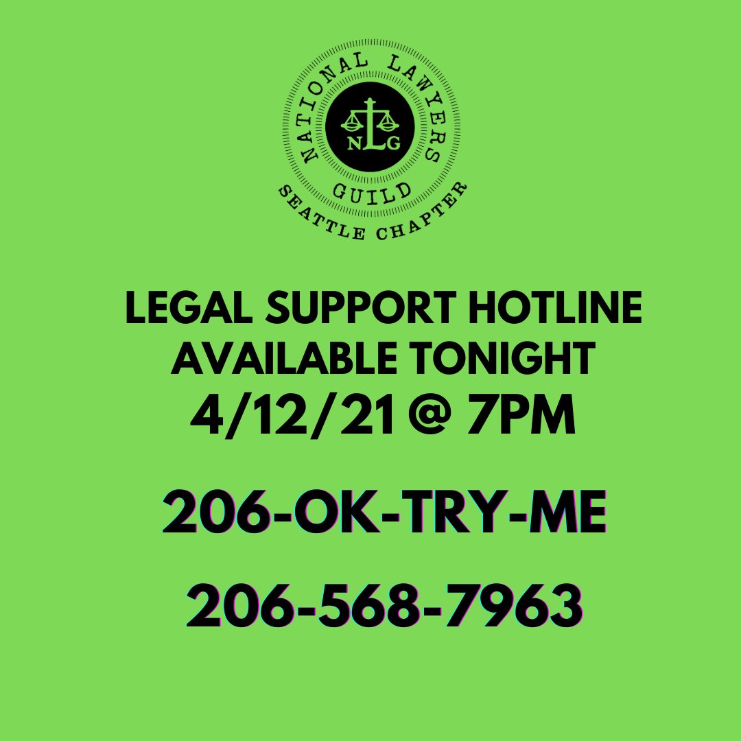 Seattle NLG Legal Support/Arrest Hotline is open tonight, April 12 at 7pm. 206-OK-TRY-ME or 206-568-7963pic.twitter.com/qF8bwvbeSm