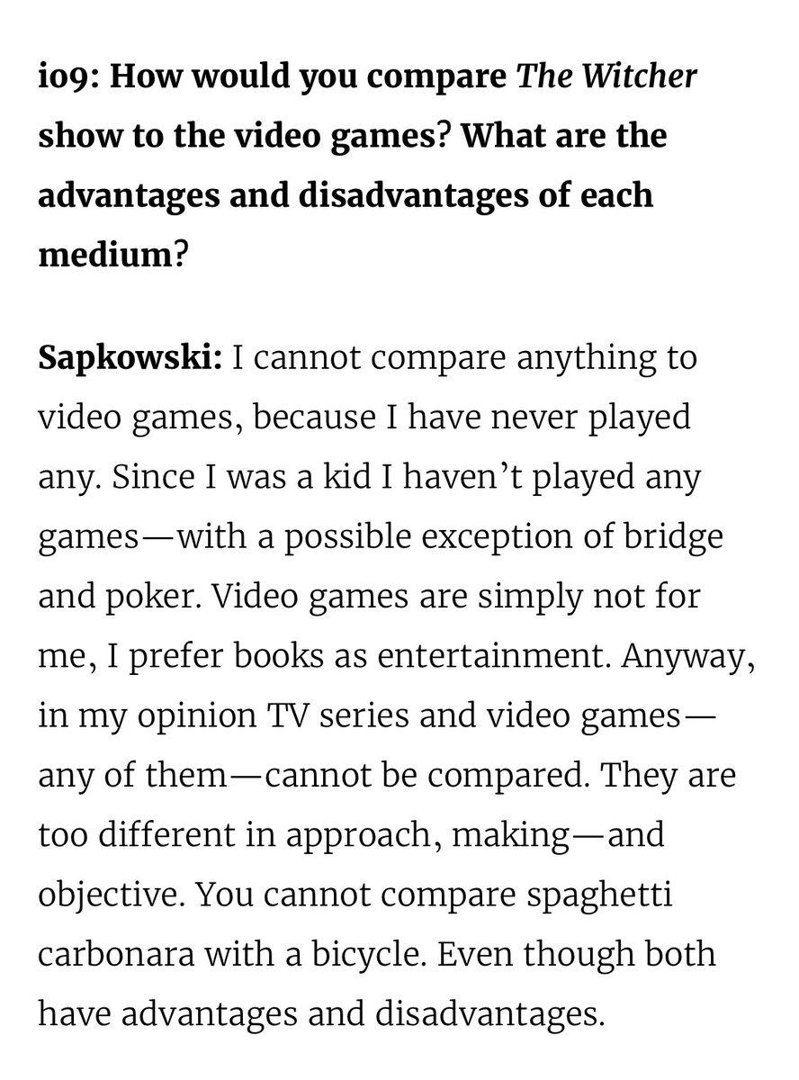 The Witcher author on comparing the books, show, & video game: “You cannot compare spaghetti carbonara with a bicycle.” https://io9.gizmodo.com/i-do-not-like-working-too-hard-or-too-long-a-refreshin-1841209529 …pic.twitter.com/c66s9aODkR