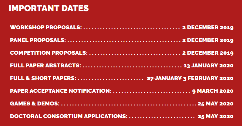 About 3 1/2 weeks until the FDG 2020 paper deadline! Papers due January 27; full-papers need to register just the abstracts two weeks earlier, January 13. http://fdg2020.org/calls.php
