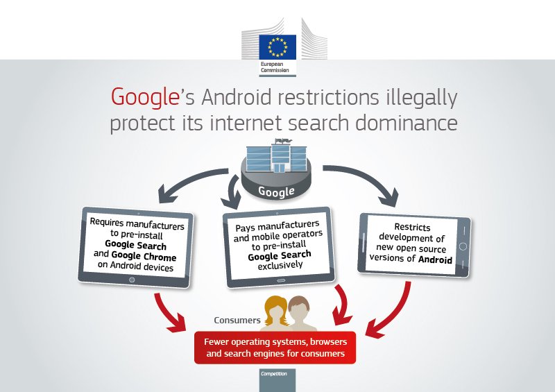 #グーグル が、基本ソフト「アンドロイド」を使う携帯端末に自社の検索ソフト搭載を求めるなど、EUの反トラスト法に違反するような競争妨害行為があったとして同社に4.34億ユーロの制裁金を科すと発表した#EUinJapan http://euin.jp/20190719a pic.twitter.com/yWZ17Aw4WU