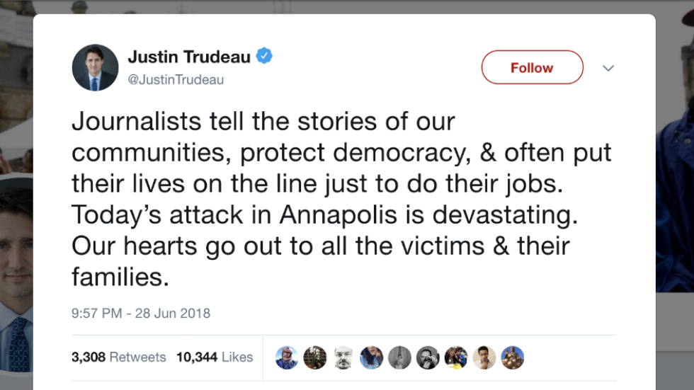 Trudeau offers condolences after Capital Gazette shooting: Journalists put their lives on the line to do their jobs http://hill.cm/W09vhK0 pic.twitter.com/vRWwstEA8W