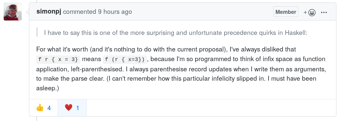When you are feeling tired, better don’t design programming languages! -- https://github.com/ghc-proposals/ghc-proposals/pull/282#issuecomment-547202105 …