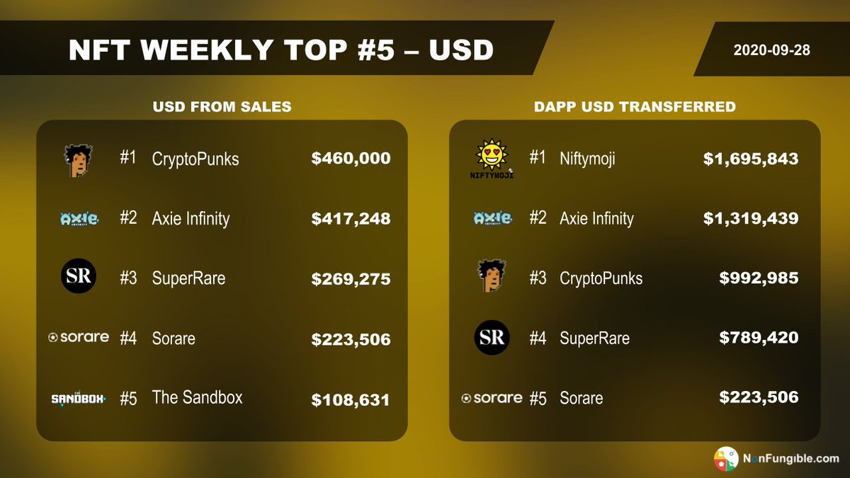 💲 WEEKLY TOP #5 PER USD TRADED 💲 DAPP USD VOLUME #1 @niftymoji #2 @AxieInfinity #3 @larvalabs #4 @SuperRare_co #5 @SorareHQ USD ONLY FROM SALES #1 @larvalabs #2 @AxieInfinity #3 @SuperRare_co #4 @SorareHQ #5 @TheSandboxGamepic.twitter.com/6ywAsAxNSk