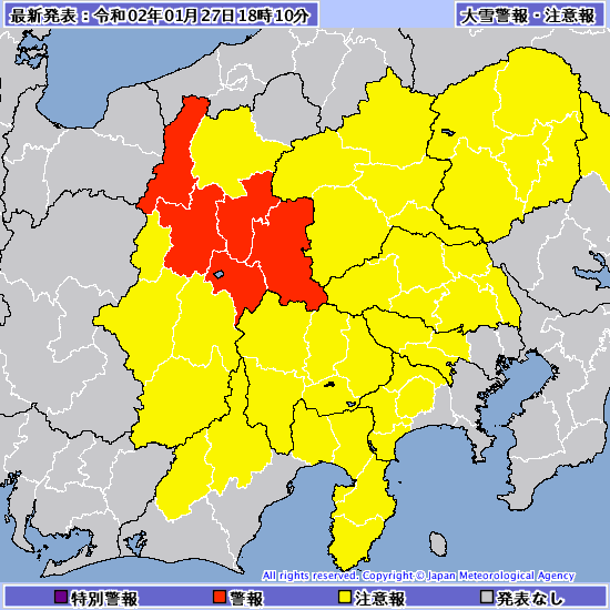 長野に大雪警報,東京都多摩・埼玉・神奈川西部・茨城北部・栃木・群馬・山梨・静岡に大雪注意報が発表されています(27日18:10現在).大雪による交通障害に十分お気をつけください.今回湿った重い雪となるため,ビニールハウスやカーポート倒壊,電線や樹木への着雪にもご注意ください.