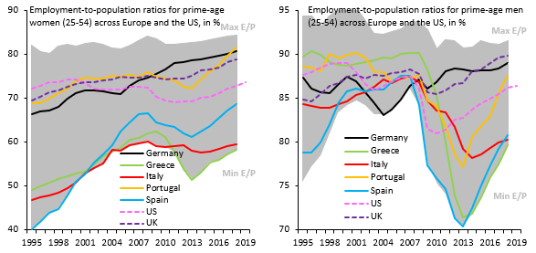 The UK is a positive outlier when it comes to labor markets. Employment among prime-age women (lhs) and men (rhs) is above where it was before the global financial crisis, in contrast to most other advanced economies. In fact, male prime-age employment is higher than in Germany.pic.twitter.com/ZP7QbGn60x