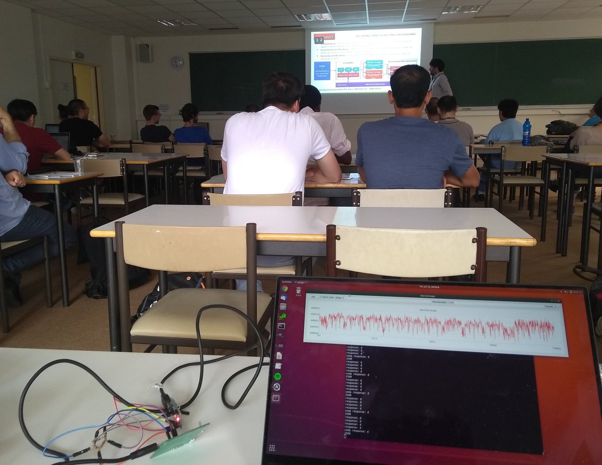 Doing some power analysis to steal AES keys with the HorrorScope, during the final talk of the week - about side-channel attacks and countermeasures - at the SILM summer school. Also got almost all of the key on Wednesday during