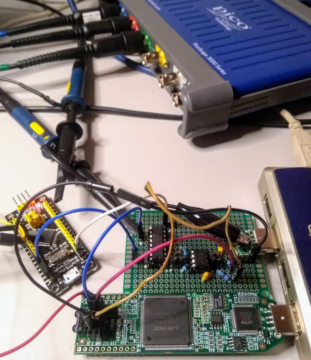 Albert Spruyt and I have been slowly bashing at cheap voltage glitcher prototypes. One of the simpler ones - an FPGA and a cheap opamp driving both inputs of an analog switch - seems promising. Tens of attempts per second means fast results - look at all the beautiful glitches!pic.twitter.com/JViwZWlluP