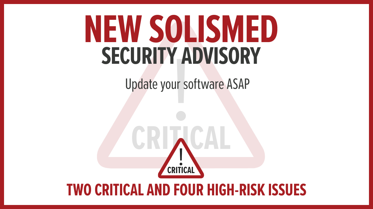 #security advisory highlights critical + high-risk issues in the#opensource healthcare software –#Solismed. Please update to the latest version ASAP: https://hubs.ly/H0mbkzb0 pic.twitter.com/urJRdz9eoM