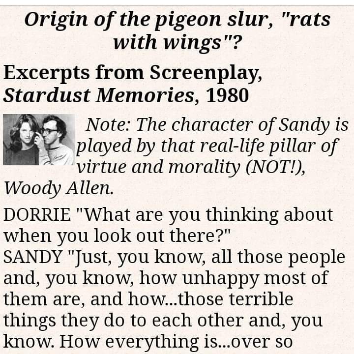 Pigeons are despised and, thus, mistreated and exterminated just because of a STUPID PUN. Woody Allen and, previously, Thomas Hoving (NY park comissioner in the 60s) destroyed the birds' reputation out of personal prejudice, not science or truth. NO MORE SLURS! NO MORE HATE!pic.twitter.com/Hnc0ySeV4R