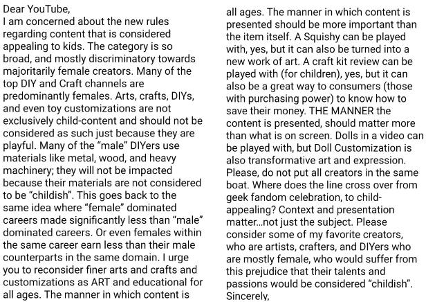 @YouTube @TeamYouTube please don't put all 'childish' and 'girly' topics in the kids category. not all content that includes dolls or cartoons or anything else, is targeted at children. i'm not a kid, and i personally watch lots of ooakers and miniature creators-- this is *art*.pic.twitter.com/6ANgbA8Kbg
