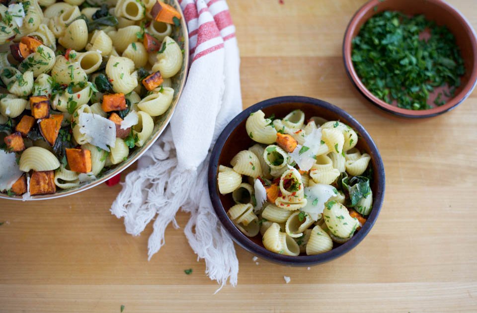 A big bowl of this Crispy Sweet Potato and Sautéed Chard Pasta will warm you up in no time!