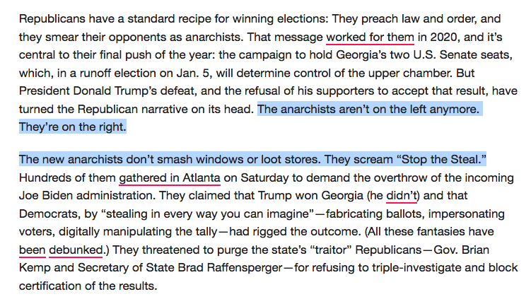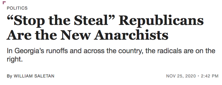 This piece sucks so much and is so stupid and doesn’t understand anarchism and harbors illusions that “law and order” was ever anything other than a fascist sloganhttps://slate.com/news-and-politics/2020/11/stop-the-steal-republicans-anarchists.html …