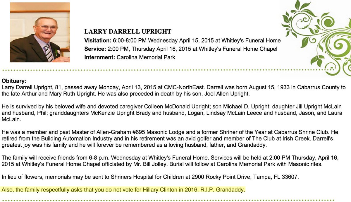Now that's commitment - This North Carolina man's obituary asked mourners not to vote for Hillary Clinton:pic.twitter.com/IzQTz3kNA1