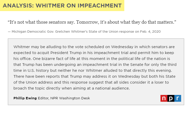 "It’s not what those senators say. Tomorrow, it’s about what they do that matters," Michigan Gov. Gretchen Whitmer said, likely a nod to the Senate impeachment vote. Neither she nor President Trump directly mentioned impeachment in their speeches. https://trib.al/1jct2B6 pic.twitter.com/YwoP5UB2D8