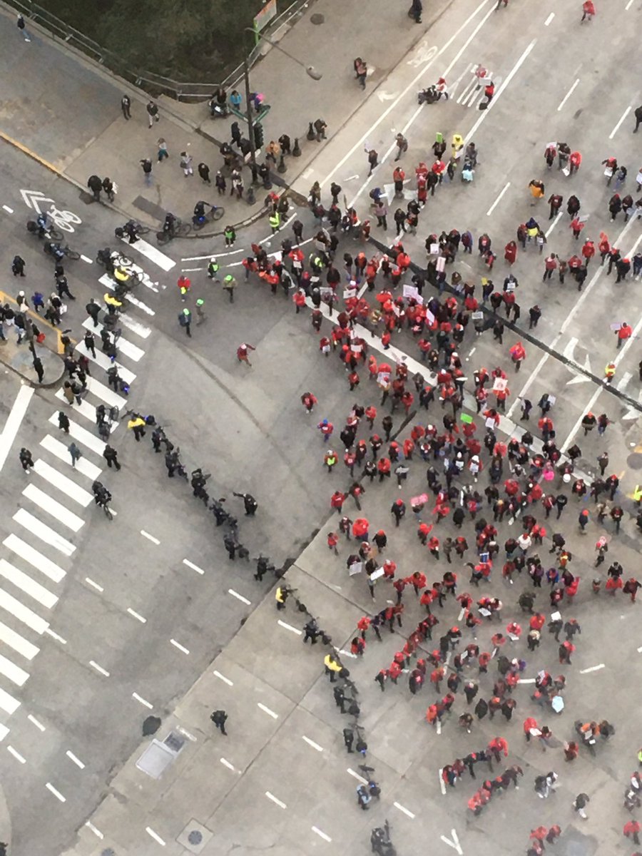 A view from above as Striking Chicago teachers in red shirts take over busy Michigan Avenue (with scores of bicycle police, squad cars and an ambulance following). The strike is in its 7th day).pic.twitter.com/nZLpFrgdm0