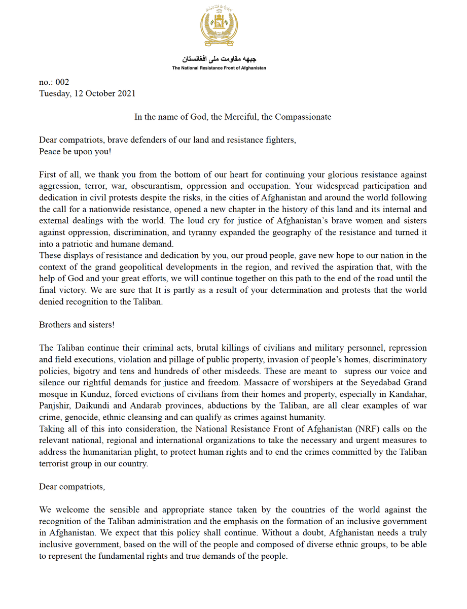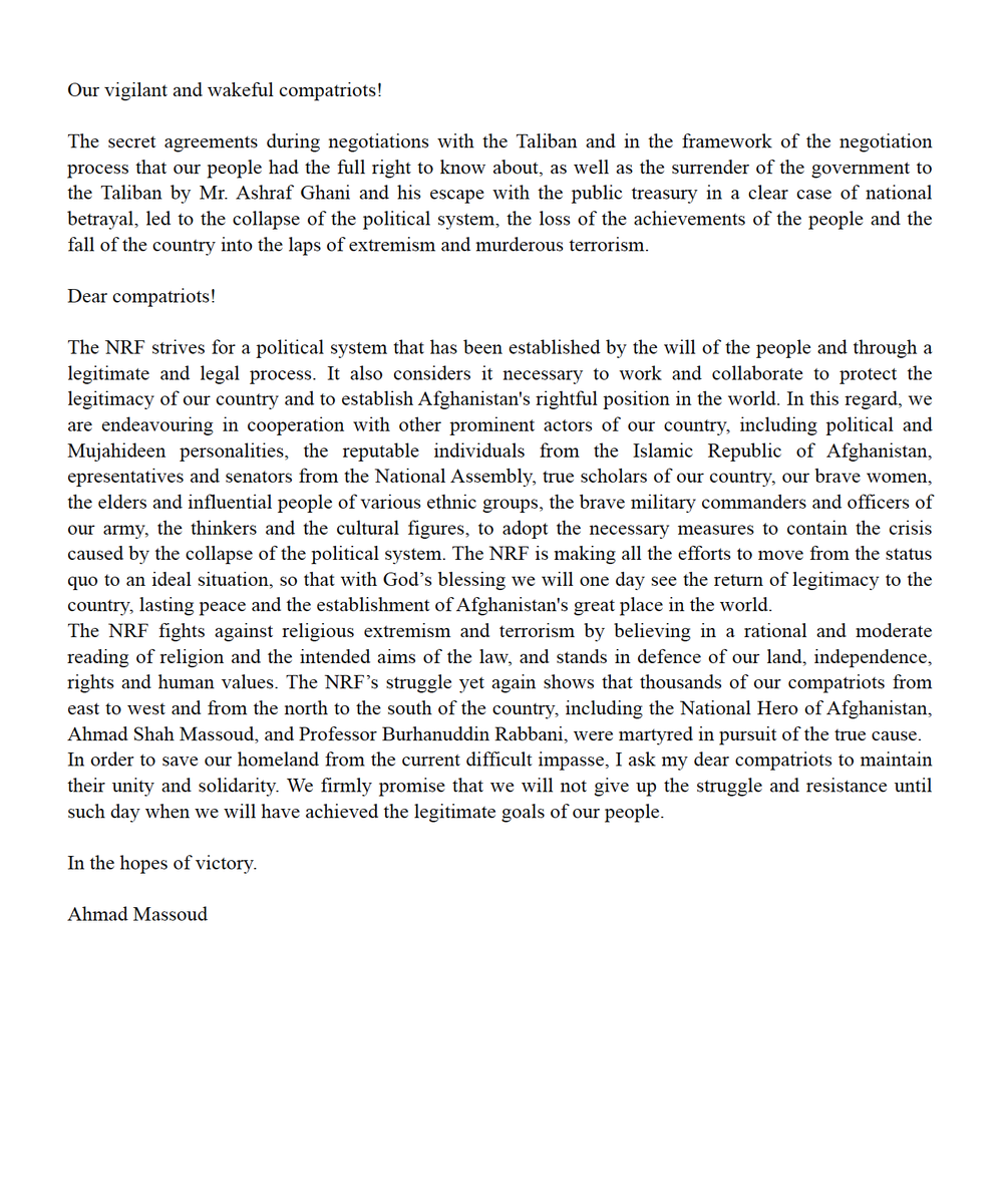 اعلامیهی رسمی محترم احمد مسعود، رهبر جبهه مقاومت ملی به زبانهای فارسی و انگلیسی An official announcement by the National Resistance Front of Afghanistan's leader