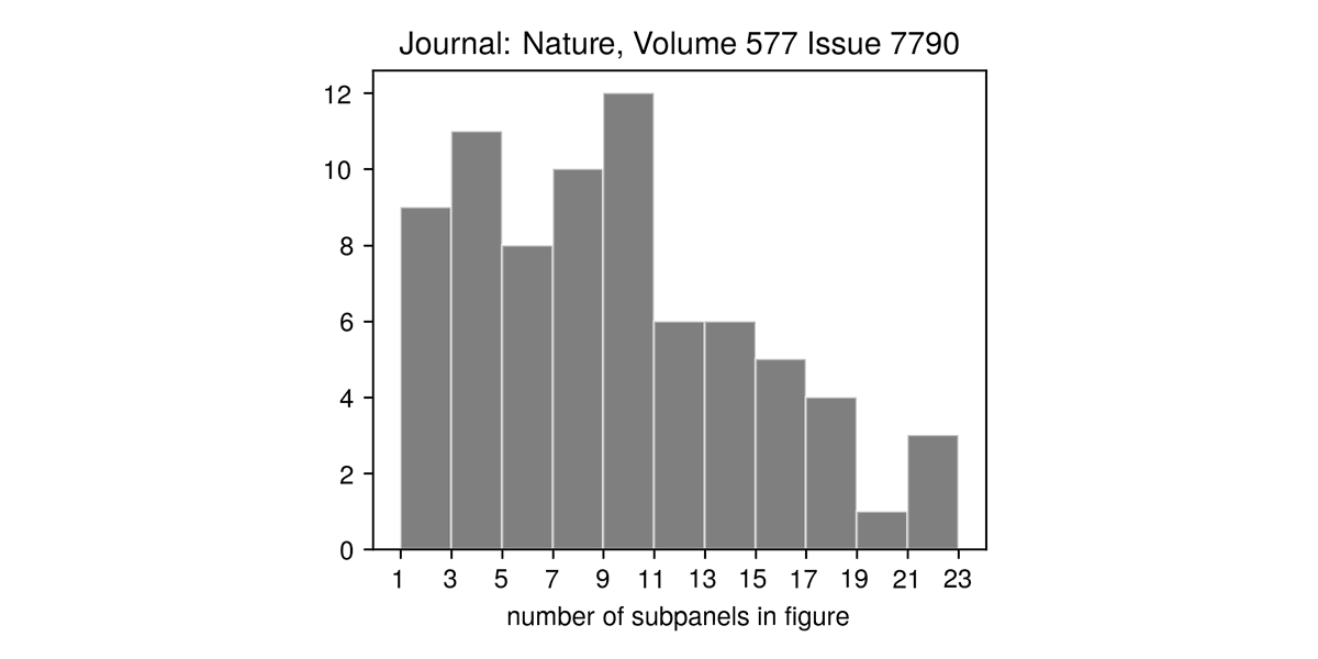the number of subpanels per figure in the current issue of Nature (16 Jan). so probably start out with 9-10 subpanels and go from there, complement with insets to you don't appear light on the data side. (triggered by a recent meta-discussion)pic.twitter.com/5VWaOGlfHJ