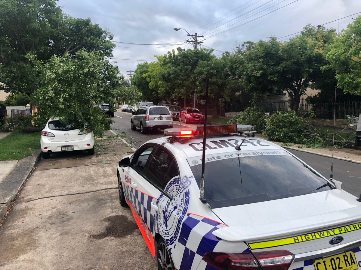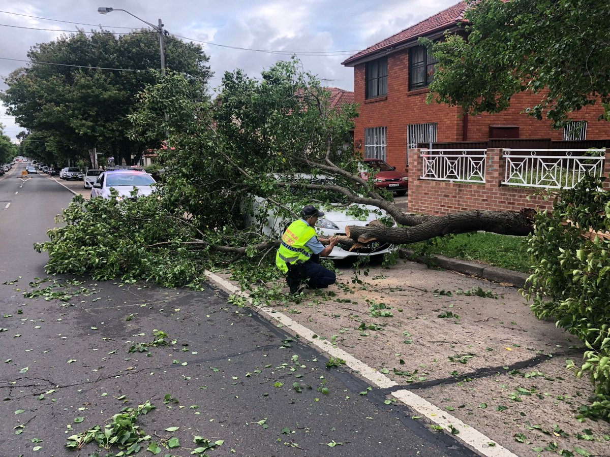 Enterprising officer not stumped by fallen tree; branches out with borrowed saw to clear road in Marrickville. Tree fell in a storm, with no injuries reported.pic.twitter.com/bRFB9x7NgT