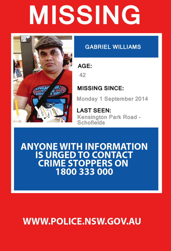 Have you seen #missing man Gabriel Williams? Contact Crime Stoppers immediately 1800 333 000: https://www.police.nsw.gov.au/news/media_release_archive?sq_content_src=%2BdXJsPWh0dHBzJTNBJTJGJTJGZWJpenByZC5wb2xpY2UubnN3Lmdvdi5hdSUyRm1lZGlhJTJGNDA1MDguaHRtbCZhbGw9MQ%3D%3D …pic.twitter.com/vXal8ODLYH