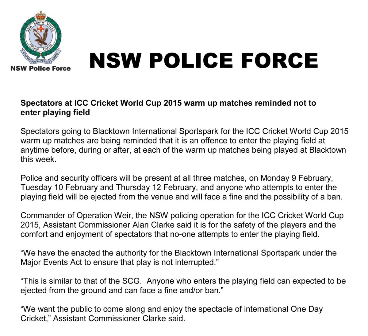 No warning yet from @nswpolice for trespassers at the #EngvWI game at the SCG tonight