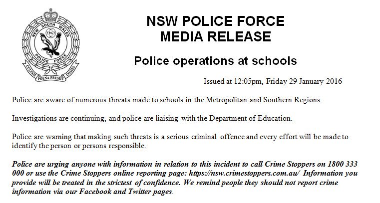 @nswpolice Gee I wonder who is behind this? Bloodbath threats at schools - another violent introduction to Australia. -