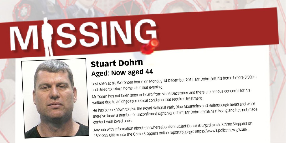 Have you seen Stuart Dohrn? Last seen at his Woronora home on 14 December 2015. #NMPW2016 http://www.police.nsw.gov.au/news/media_release_archive?sq_content_src=%2BdXJsPWh0dHBzJTNBJTJGJTJGZWJpenByZC5wb2xpY2UubnN3Lmdvdi5hdSUyRm1lZGlhJTJGNTYwMzYuaHRtbCZhbGw9MQ%3D%3D …pic.twitter.com/sYKphPdaLR