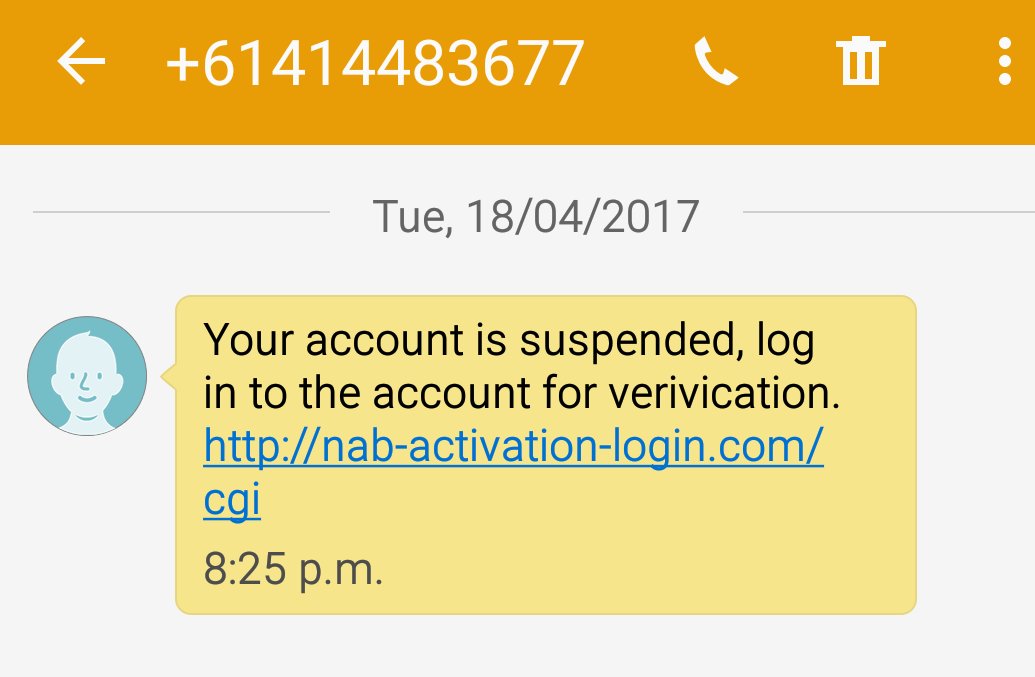 @nswpolice received a dodge text message. Link takes you to a page hosted on a cheap overseas vps that attemots to phish @NAB customerspic.twitter.com/g34J8n5BdT
