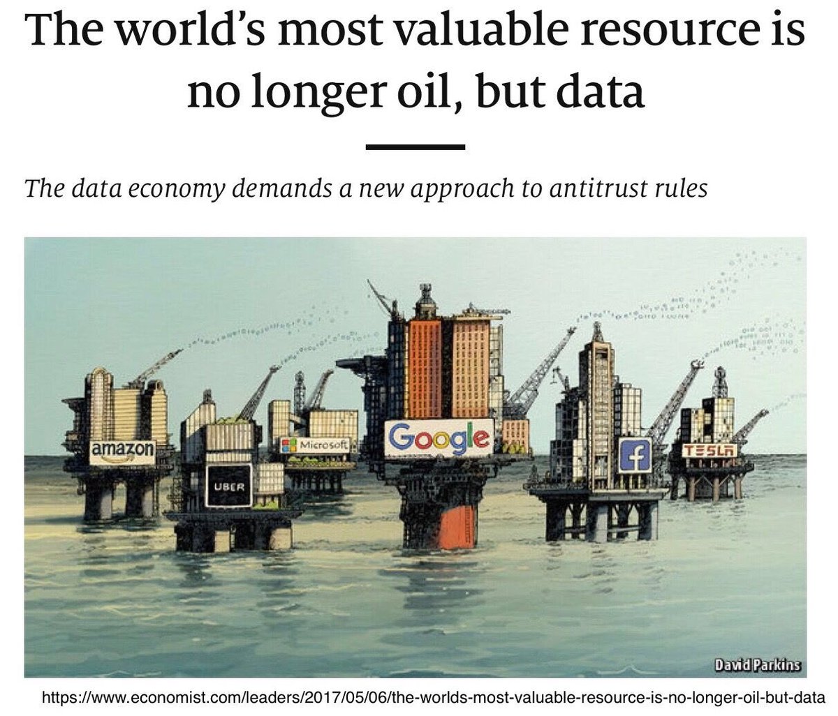 Data is a new “oil” of the modern economy and accordingly should be regulated. “The data economy demands a new approach to antitrust rules” - Economist, May 2017 https://www.economist.com/leaders/2017/05/06/the-worlds-most-valuable-resource-is-no-longer-oil-but-data … Via