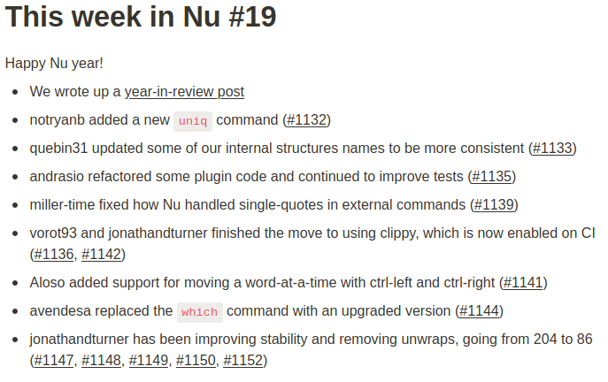 @nu_shell #19 - Happy Nu year. A new command, bugfixes, now clippy-clean(!), and moving towards better stability. https://www.notion.so/nushell/This-week-in-Nu-19-e335a1edfd7f4277a1dcd93347bfd003 …pic.twitter.com/YFkBa3unAV