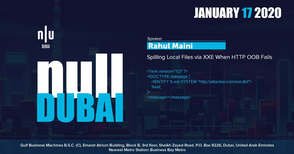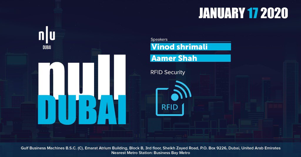@nullDubai January monthly meet@GBMComms venue at 4:00 PM with best speakers in town@iamnoooob@stvetro@aamer_sha#XXE#OOB#BugBountyTips#BugBounty#Cyber#Investigation#RFID#NullDubai#Securitypic.twitter.com/77xc8BFruj
